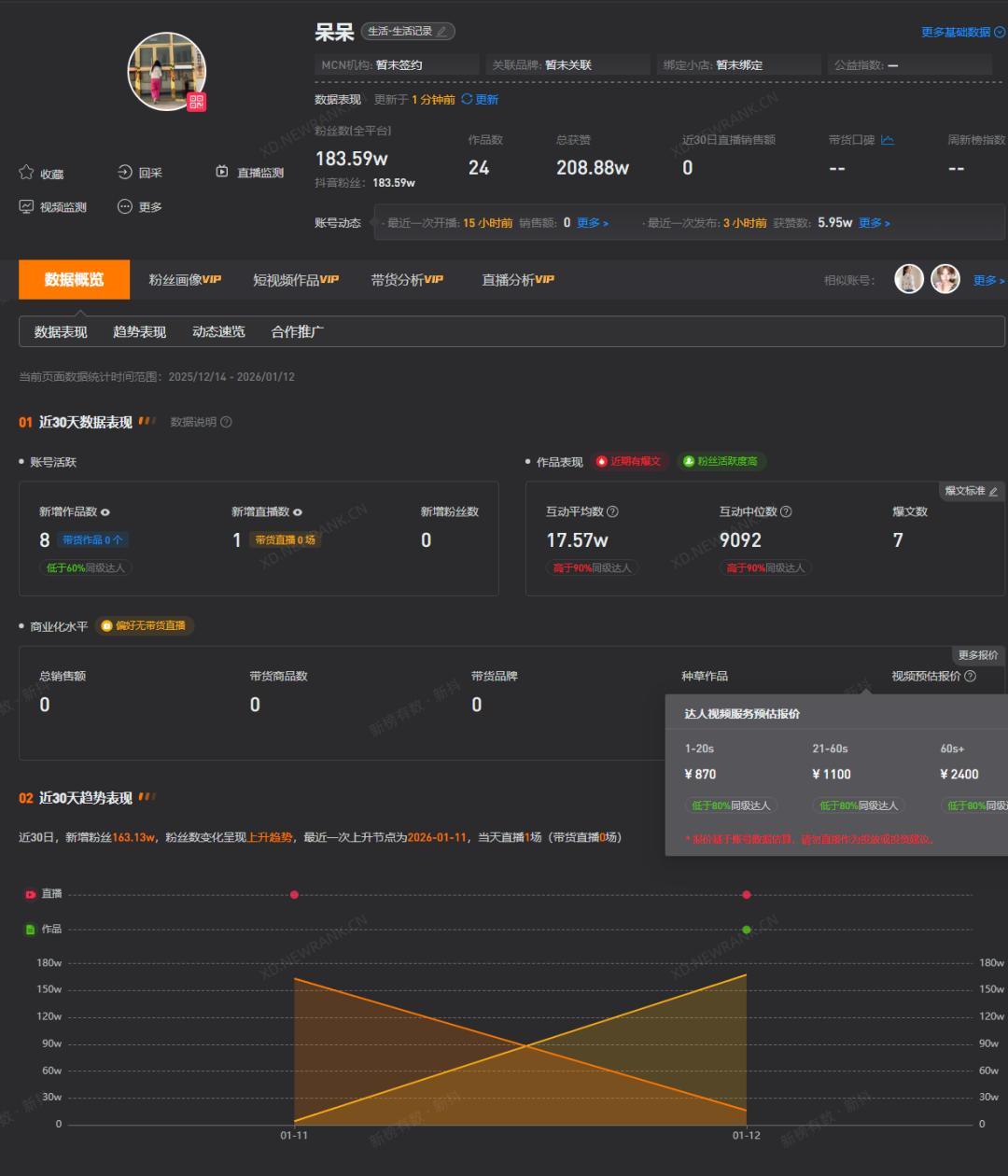 其账号60s以上视频广告报价为2400元